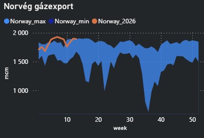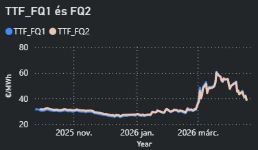 - A TTF ár egész héten hírérzékeny volt: szerdán csökkent az ár a piaci optimizmus miatt, amit Trump bejegyzése indukált – miszerint a héten vége lehet a háborúnak. Irán azonban nem erősítette meg a béketárgyalással kapcsolatos spekulációkat, sőt, további eszkalációt helyezett kilátásba. Ez csütörtökön emelte az árakat.