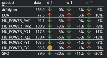 - A magyar másnapi villamosenergia-ár közel 50%-kal emelkedett a szerdai szállításra az egy héttel korábbi szinthez képest, amit regionális kiesések (900 MW) és hét eleji gázár-emelkedés támogattak
