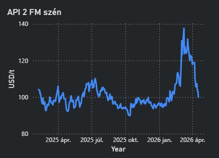 - Az európai szénpiacon az API2 front havi kontraktus ára legutóbb 2,50 dollárral csökkent, 100,65 dollár/tonna szintre.